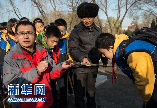 11月28日,考古專家張中華(前左)作為專業(yè)指導(dǎo)老師在圓明園遺址公園的如園遺址考古發(fā)掘現(xiàn)場向?qū)W生們介紹考古工具“洛陽鏟”。