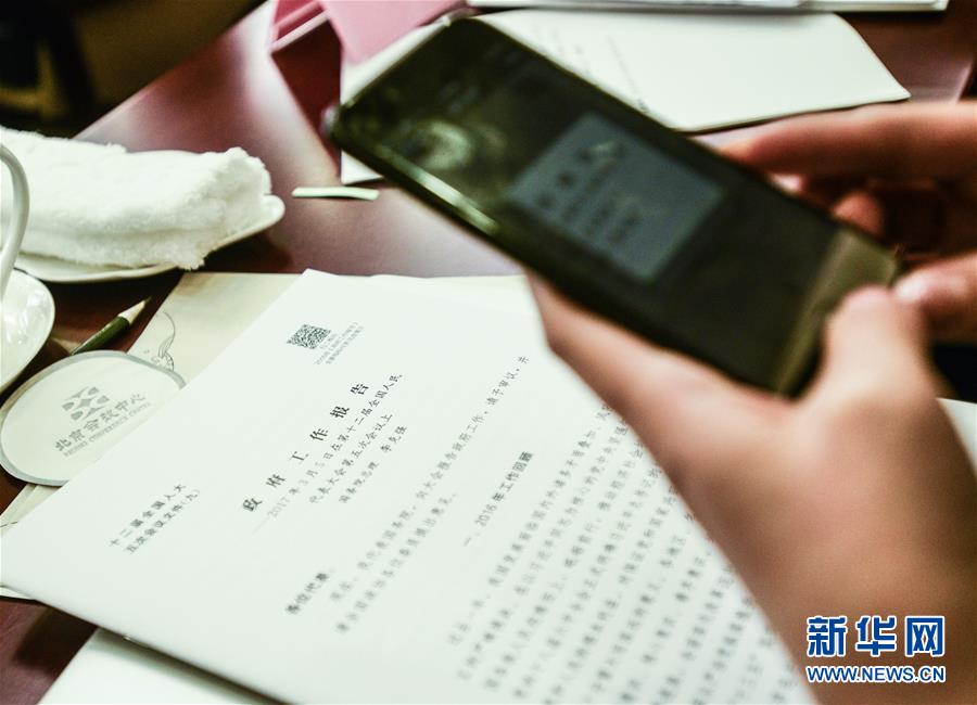 這份“互聯(lián)網(wǎng)+”的政府工作報告,讓很多人感覺到了便捷。新華社記者王建華 攝 3月5日,在北京會議中心,一名記者掃描政府工作報告文本上的二維碼獲取信息。今年政府工作報告文本上首次印上二維碼,并附有文字說明:“掃二維碼 2016年《政府工作報告》主要指標任務(wù)完成情況”。用手機掃描二維碼,會掃出政府工作報告中有關(guān)主要指標任務(wù)完成情況的各項數(shù)據(jù)。 -