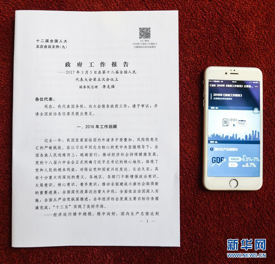 這份“互聯(lián)網(wǎng)+”的政府工作報告,讓很多人感覺到了便捷。新華社記者王建華 攝 這是3月5日拍攝的首次印上二維碼的政府工作報告文本(左)和手機掃描出的政府工作報告文本中有關(guān)主要指標任務(wù)完成情況的各項數(shù)據(jù)。今年政府工作報告文本上首次印上二維碼,并附有文字說明:“掃二維碼 2016年《政府工作報告》主要指標任務(wù)完成情況”。用手機掃描二維碼,會掃出政府工作報告中有關(guān)主要指標任務(wù)完成情況的各項數(shù)據(jù)。