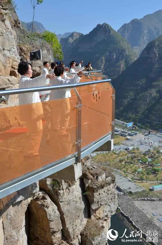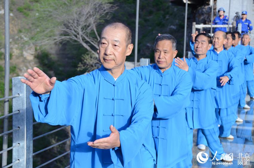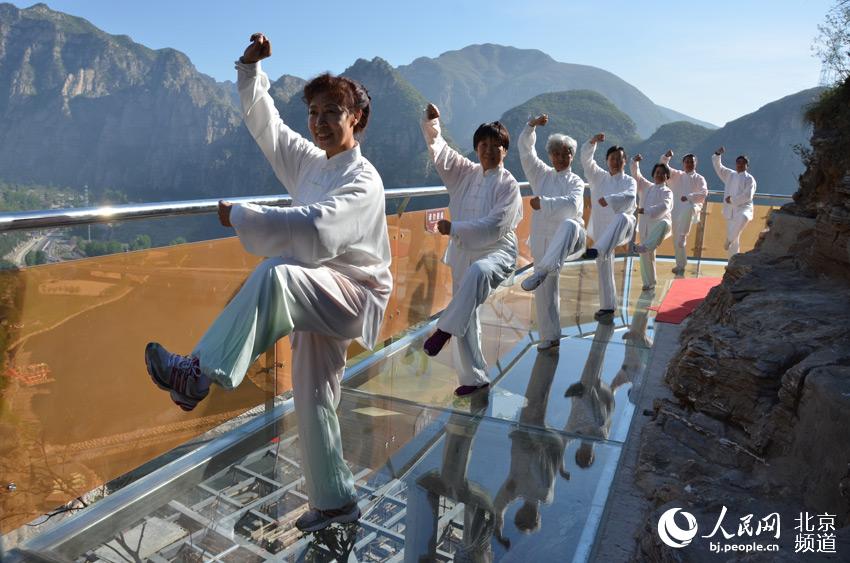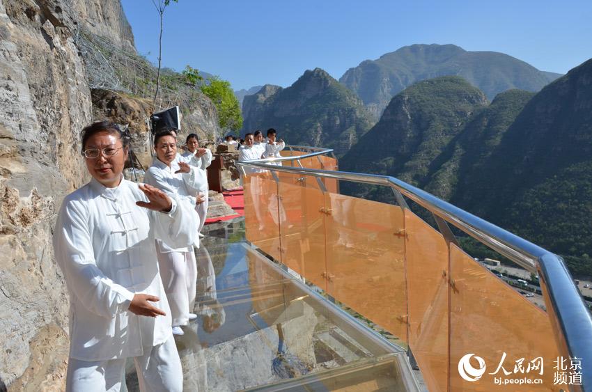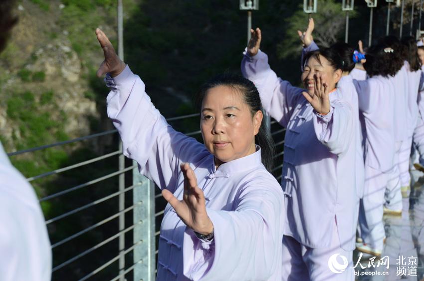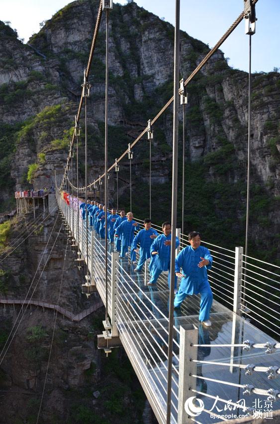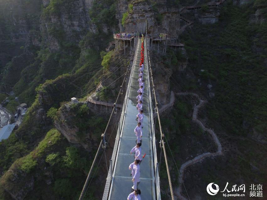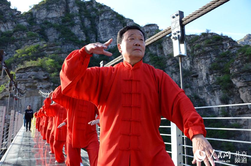 北京市房山區(qū)樂谷銀灘景區(qū)上演“云端”太極,參與者高空淡定自若。 -