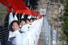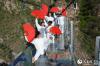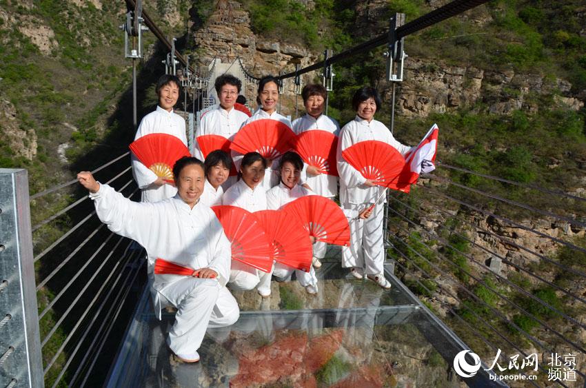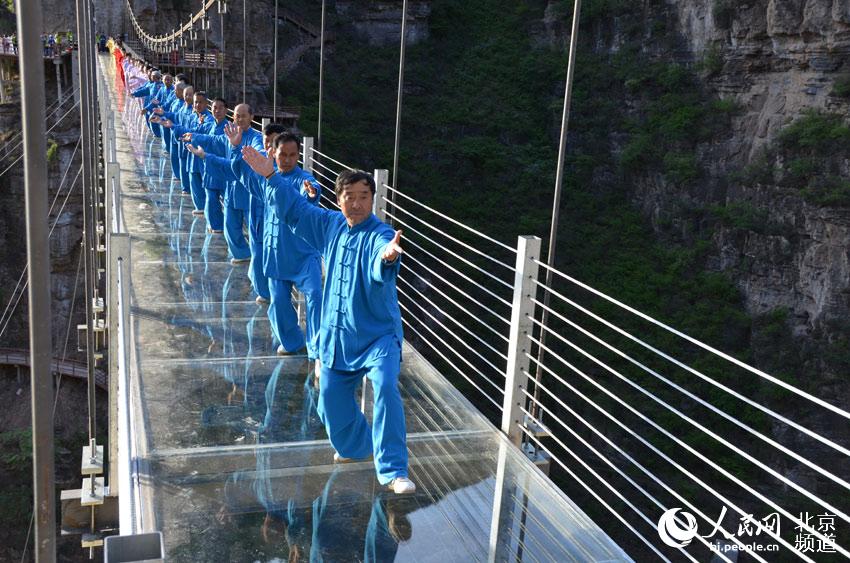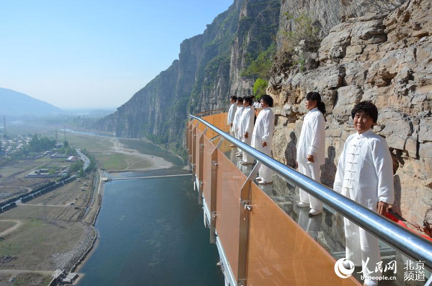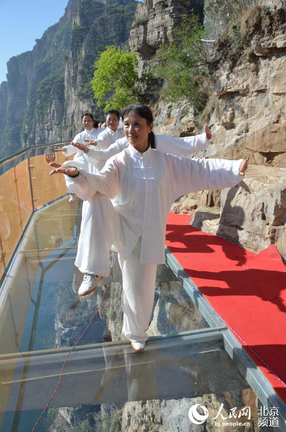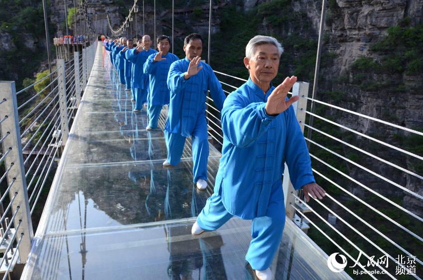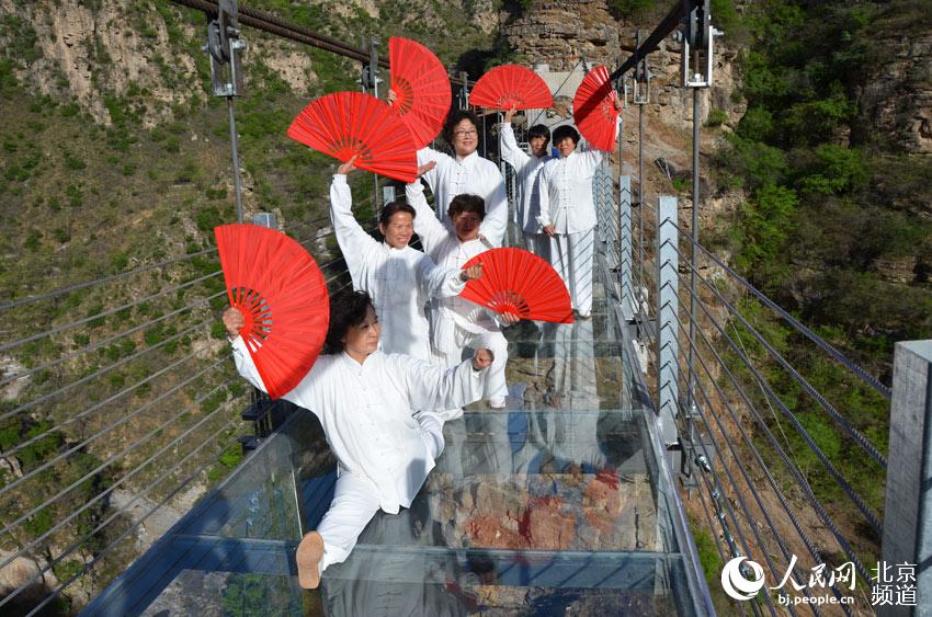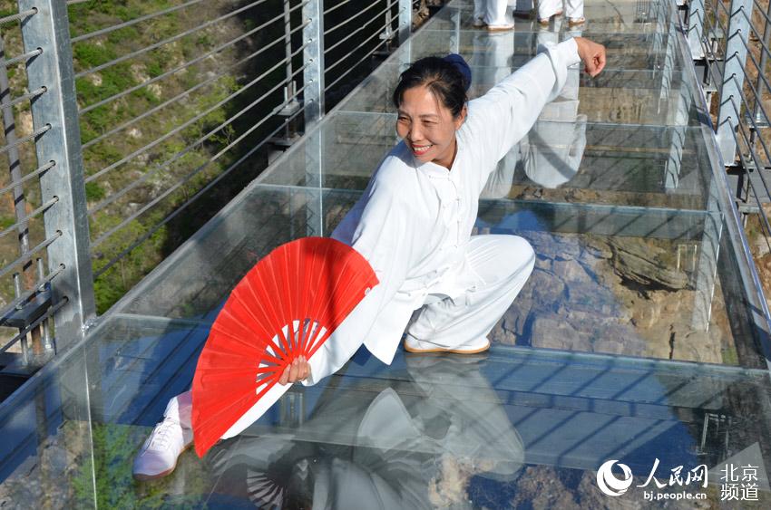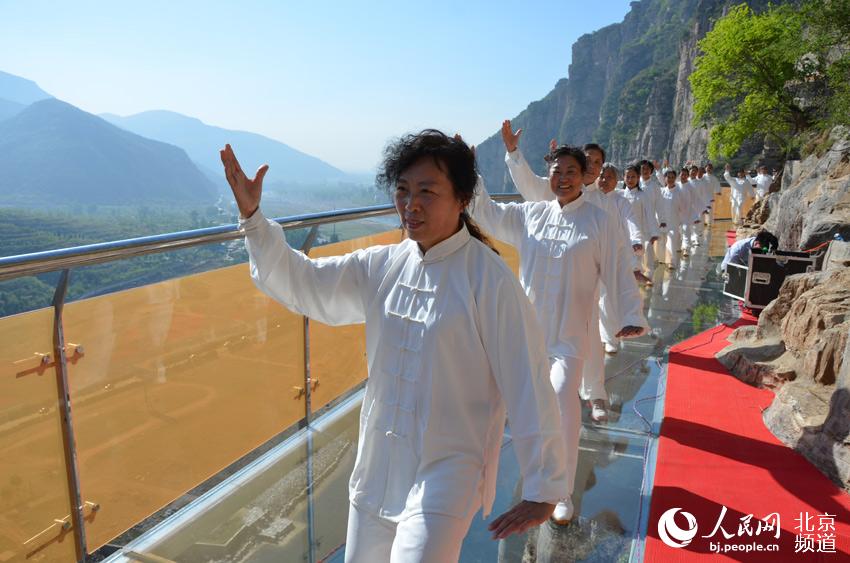 北京市房山區(qū)樂谷銀灘景區(qū)上演“云端”太極,參與者高空淡定自若。 -