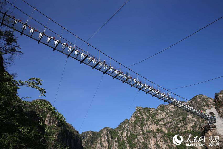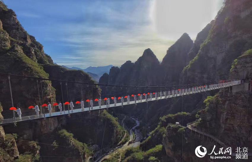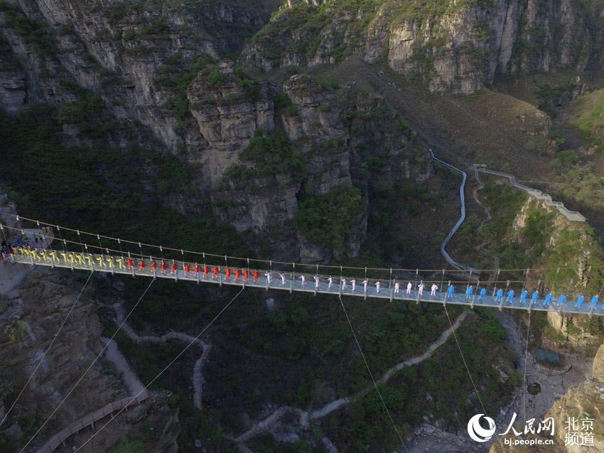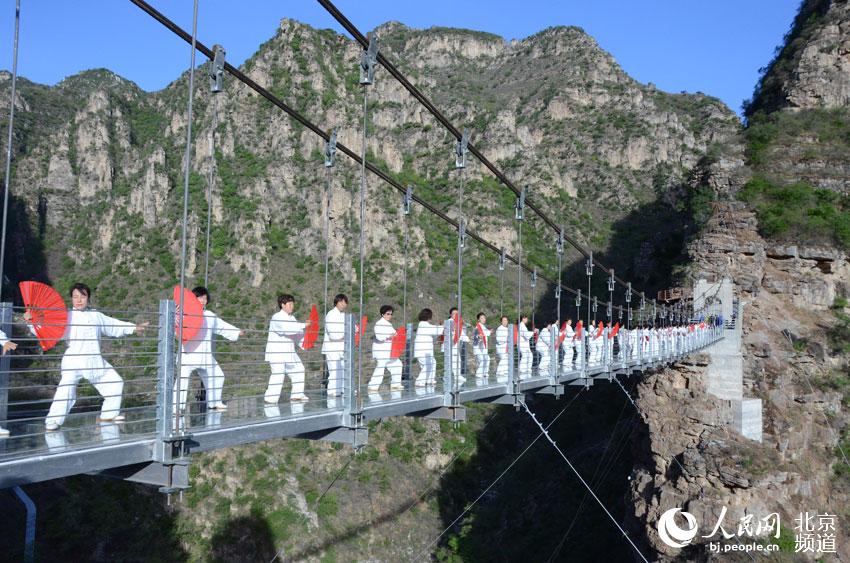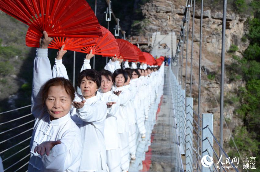 北京市房山區(qū)樂谷銀灘景區(qū)上演“云端”太極,參與者高空淡定自若。人民網(wǎng)尹星云 攝
