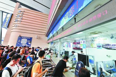 10日,受臺風(fēng)“利奇馬”影響,北京南站多趟高鐵列車停運(yùn),售票窗口的大屏幕滾動(dòng)顯示退票改簽公告,站內(nèi)增設(shè)多個(gè)退票和改簽窗口,以減少乘客損失。本報(bào)記者 和冠欣
