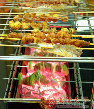食客自己將烤串放置在店家特別設(shè)計(jì)的烤爐上,隨著鏈條的滾動(dòng)烤串便會(huì)自動(dòng)翻滾,均勻烤熟?竞煤罂梢詫⒖敬茉跔t子的上層,這樣既能保溫又不至于使食物烤焦。小編認(rèn)為這樣烤出來(lái)的食物受熱非常均勻,外焦里嫩,比一般店里師傅烤出來(lái)的還要好。