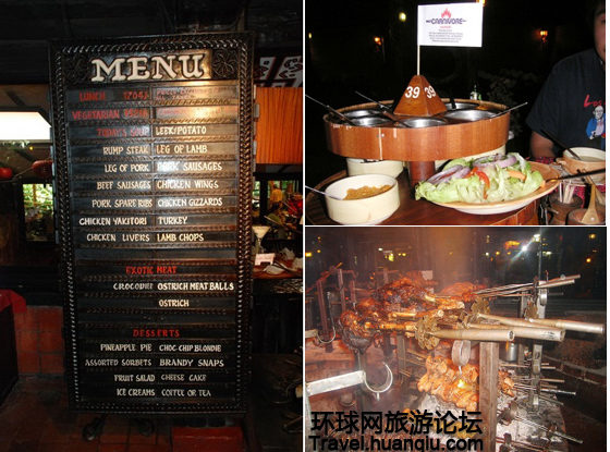 顧名思義,這是一個吃特色肉類的餐廳。大家大可放心,這家餐館能光明正大地吸引世界食客的原因是因為它賣的不是國家公園的野生動物,而是經(jīng)過政府批準的自己圈養(yǎng)的動物,好比我們農(nóng)場里養(yǎng)的牛和羊。在肯尼亞打獵是違法的,所以吃野生動物也是禁止的。