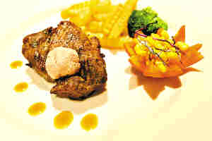新西蘭牛柳釀鵝肝醬 大廚介紹說(shuō)這個(gè)鵝肝醬是自制的,夾在牛柳中間,煎的過(guò)程它會(huì)滲到牛肉里面,味道很特別。這個(gè)扒配菜是薯?xiàng)l和玉米。