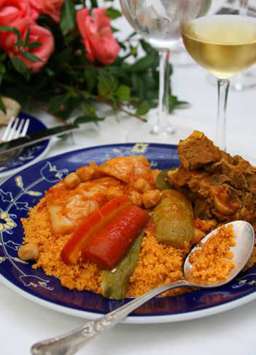傳統(tǒng)的couscous當(dāng)仁不讓地成為突尼斯人最喜歡的主菜。很多人嘗過(guò)之后都會(huì)念念不忘這道長(zhǎng)盛不衰的特色菜肴。亮晶晶的主食看上去很像小米,但口感卻是完全不同。這種主食基本的配菜會(huì)是大塊雞肉或羊肉,再輔之以土豆、胡蘿卜、西葫蘆或者炸好的青椒等,肉香混合著青菜的香氣,讓人垂涎欲滴。