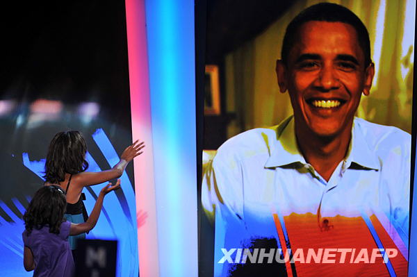 這是2008年8月25日,在美國(guó)丹佛市舉行的民主黨全國(guó)代表大會(huì)上,奧巴馬的女兒薩莎(左)和馬莉婭通過(guò)視頻連線奧巴馬。新華社/法新