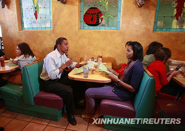這是2008年11月1日,奧巴馬與家人在美國(guó)科羅拉多州普韋布洛市的一家墨西哥餐廳用餐。新華社/路透
