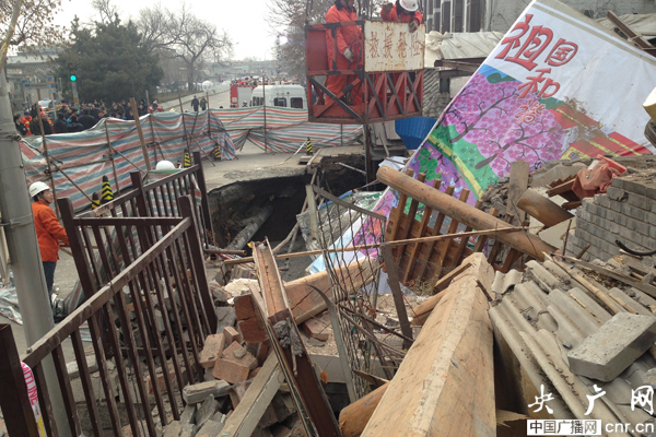 1月24日凌晨6點,北京市政府值班室接到情況通報:德勝門內(nèi)大街93號門前發(fā)生坍塌,出現(xiàn)長15米、寬5米、深10米大坑,當天中午12點10分,該民宅北側(cè)4間房屋發(fā)生倒塌,倒塌面積約54平米,無人員傷亡。北京市多個職能部門立即到現(xiàn)場配合搶險工作。市住建委巖土工程專家何世鳴告訴記者,從昨天下午4點到今天凌晨4點,已經(jīng)填進去1900多方混凝土: