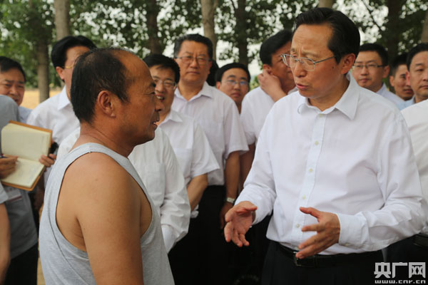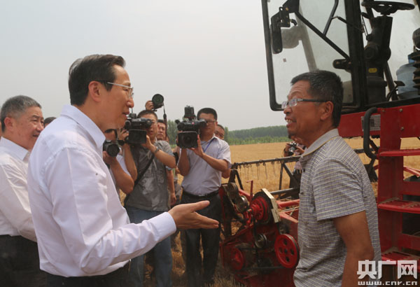 農(nóng)業(yè)部部長(zhǎng)韓長(zhǎng)賦向東阿縣棗楊村村民詢問(wèn)夏糧收成(攝影記者黃光輝)