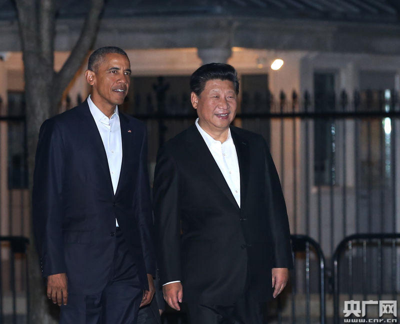 記者現(xiàn)在就站在白宮北側(cè)的賓夕法尼亞大街旁,大概半小時前,也就是當(dāng)?shù)貢r間晚上7點(diǎn)半,習(xí)近平和奧巴馬從白宮西北側(cè)的大門步行而出,經(jīng)過賓夕法尼亞大街,進(jìn)入到布萊爾國賓館。這段路程非常近,大概只有100米,兩人身著深色西裝、白色襯衫,沒有打領(lǐng)帶,邊走邊聊,頗有去年在北京瀛臺夜話的感覺。不過9月華盛頓的夜晚并沒有11月北京秋夜那樣寒冷,各界也期待兩國元首能夠在這樣輕松的氣氛中,充分交流,達(dá)成更多共識,同時,也為明天的國事活動做足準(zhǔn)備。