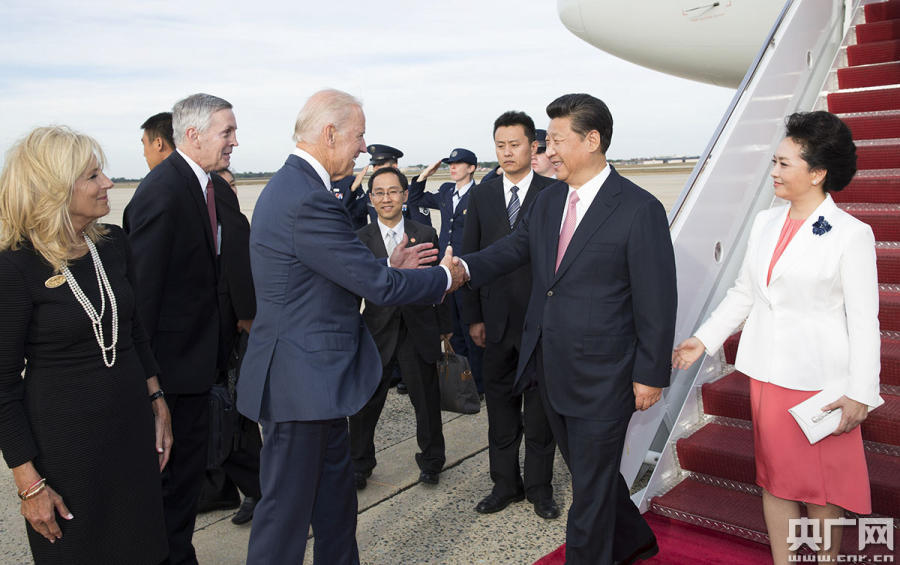 下午5時40分許,習(xí)近平乘坐的專機(jī)抵達(dá)華盛頓安德魯斯空軍基地。美國副總統(tǒng)拜登和夫人專程來到機(jī)場,熱情歡迎習(xí)近平和夫人彭麗媛。美國兒童向習(xí)近平夫婦獻(xiàn)花。禮兵分列紅地毯兩側(cè)。軍樂隊(duì)奏響中美兩國國歌。