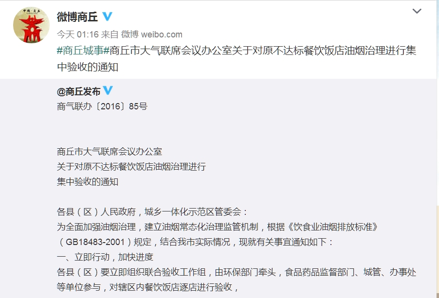 央廣網(wǎng)商丘7月30日消息(記者管昕)昨天,中國(guó)之聲報(bào)道了河南商丘為治理大氣污染強(qiáng)關(guān)飯店和企業(yè)的事情,引起輿論關(guān)注。商丘市委宣傳部官方微博今天凌晨發(fā)文稱,當(dāng)?shù)匕l(fā)出緊急通知,要求各縣(區(qū))對(duì)原不達(dá)標(biāo)餐飲飯店油煙治理進(jìn)行集中驗(yàn)收,而且要立即行動(dòng),加快進(jìn)度。各縣(區(qū))要立即組織聯(lián)合驗(yàn)收工作組,由環(huán)保部門牽頭,多單位參與,對(duì)轄區(qū)內(nèi)餐飲飯店逐店進(jìn)行驗(yàn)收。