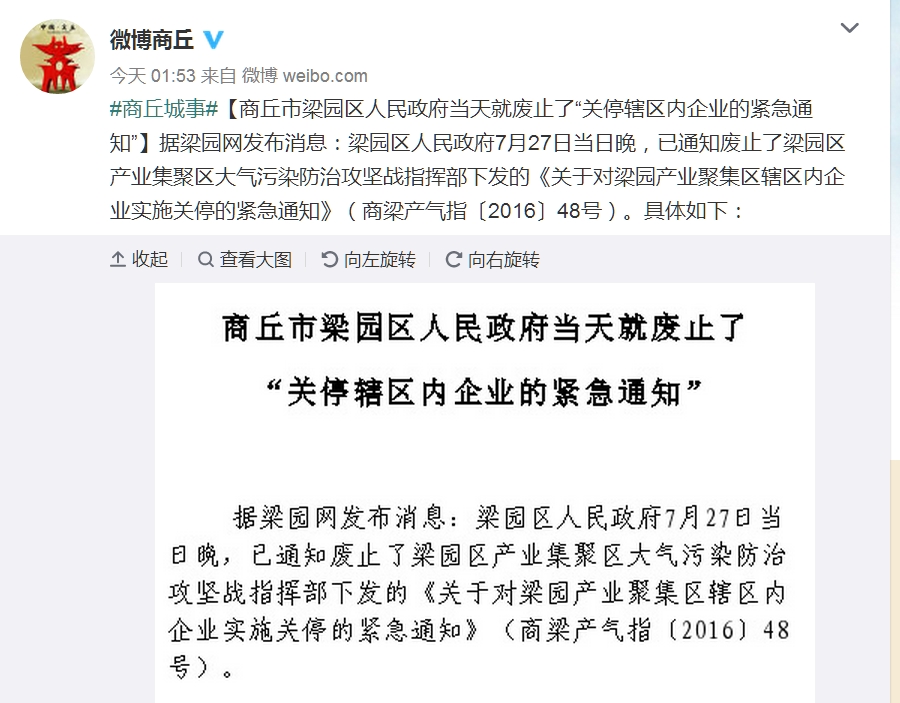 此外,針對(duì)網(wǎng)絡(luò)瘋傳梁園區(qū)7月27日紅頭文件發(fā)文要求轄區(qū)內(nèi)所有企業(yè)停產(chǎn)的消息,商丘市委宣傳部的官方微博稱,梁園區(qū)政府發(fā)文當(dāng)晚就已通知緊急叫停此做法,監(jiān)察部門正在對(duì)此決策不當(dāng)行為展開調(diào)查。據(jù)知情人士透露,該通知發(fā)文單位是商丘市梁園產(chǎn)業(yè)集聚區(qū)大氣污染防治攻堅(jiān)戰(zhàn)指揮部,梁園區(qū)政府對(duì)此紅頭文件并不知情。區(qū)政府主要領(lǐng)導(dǎo)獲知此事后,立即要求停止此做法。