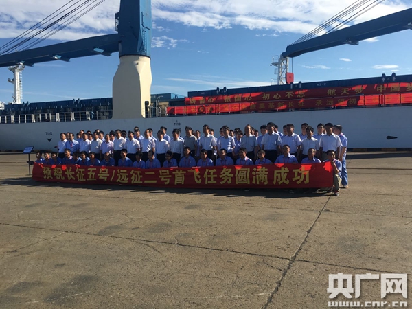 長征五號港口送行儀式后工作人員合影(央廣網(wǎng)記者張棉棉攝)