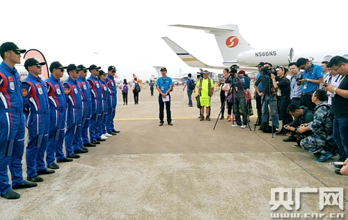 天空聯盟特技飛行表演隊接受現場媒體記者采訪