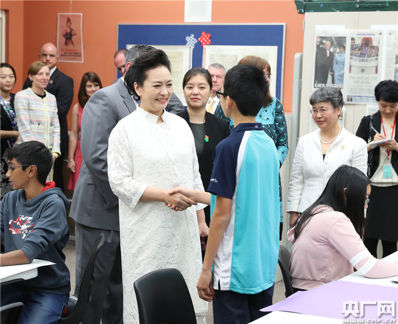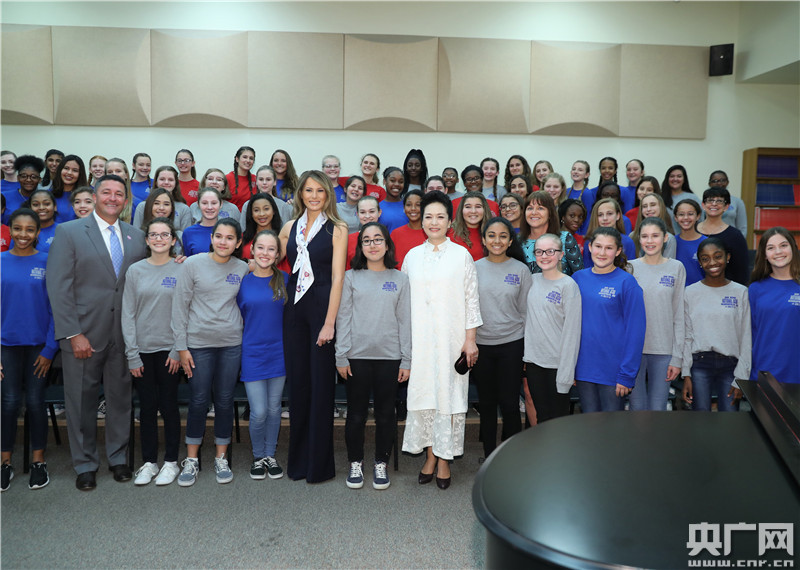 彭麗媛抵達(dá)時,梅拉尼婭和棕櫚灘郡學(xué)區(qū)長阿沃莎、巴克藝術(shù)中學(xué)校長羅贊基等在停車處熱情迎接。彭麗媛先后參觀了聲樂教室、交響樂隊教室、弦樂教室,欣賞學(xué)生演唱和樂隊表演,并同學(xué)生們親切互動交流。隨后,彭麗媛觀摩了時政經(jīng)濟(jì)課,回答了學(xué)校小記者關(guān)于“你和藝術(shù)的淵源”的提問,并接受了學(xué)生自己創(chuàng)作的水彩畫。彭麗媛表示,中美兩國可以加強藝術(shù)交流合作。希望巴克藝術(shù)中學(xué)的老師和同學(xué)們以教育和藝術(shù)為橋梁,為增進(jìn)中美兩國人民友好、推動兩國關(guān)系發(fā)展作出更多貢獻(xiàn)。