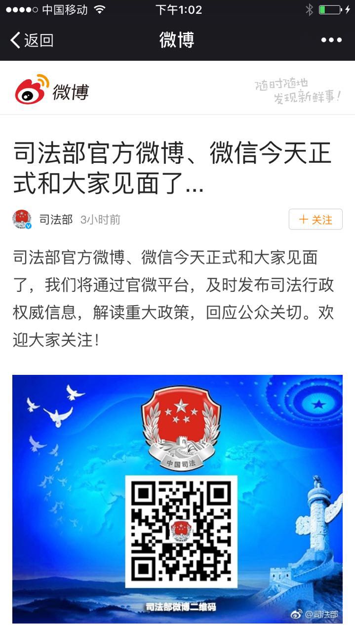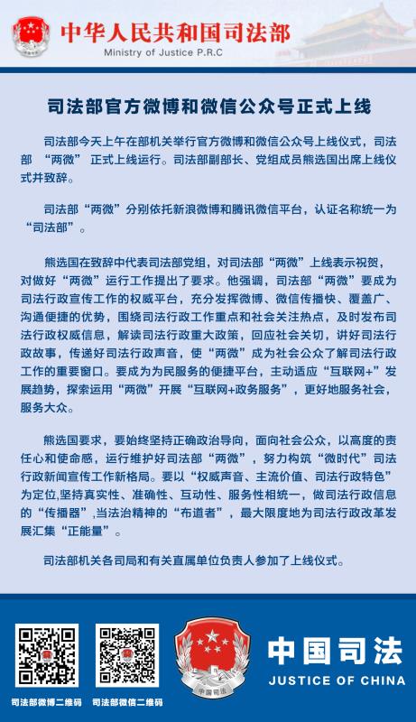 央廣網(wǎng)北京4月19日消息(記者孫瑩)司法部官方微博、微信今天正式和大家見面,表示將通過官微平臺,及時發(fā)布司法行政權威信息,解讀重大政策,回應公眾關切。