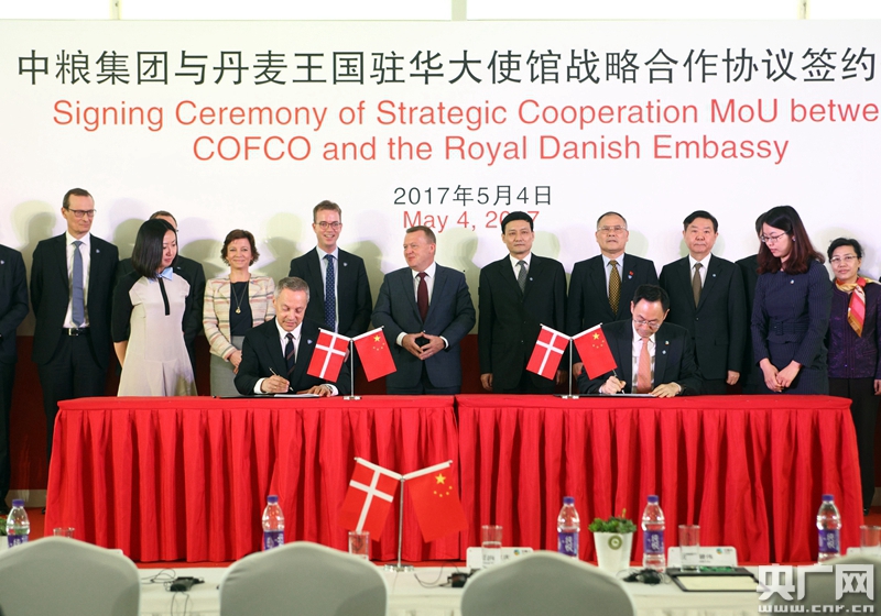 央廣網(wǎng)北京5月4日消息(記者沈靜文)在丹麥王國(guó)首相拉爾斯·勒克·拉斯穆森與中國(guó)國(guó)務(wù)院國(guó)資委主任肖亞慶共同見(jiàn)證下,中糧集團(tuán)總裁于旭波與丹麥駐華大使戴世閣今天簽署關(guān)于食品和農(nóng)業(yè)從農(nóng)場(chǎng)到餐桌全產(chǎn)業(yè)鏈合作的諒解備忘錄。備忘錄旨在增強(qiáng)雙方在食品和農(nóng)業(yè)領(lǐng)域的合作,搭建農(nóng)業(yè)和食品科技交流平臺(tái),進(jìn)一步促進(jìn)和加強(qiáng)中丹在種養(yǎng)殖、食品生產(chǎn)、有機(jī)食品、新產(chǎn)品開(kāi)發(fā)及消費(fèi)者導(dǎo)向的食品體驗(yàn)領(lǐng)域的務(wù)實(shí)合作及經(jīng)驗(yàn)信息交流。