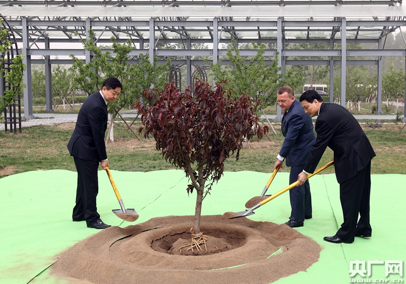 丹麥?zhǔn)紫嗬鼓律、?guó)資委主任肖亞慶、中糧集團(tuán)董事長(zhǎng)趙雙連一起種下中丹友誼樹(shù)