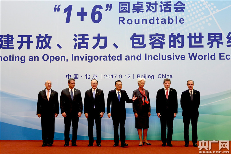 央廣網(wǎng)北京9月12日消息(記者馮悅)9月12日上午,國務(wù)院總理李克強(qiáng)在釣魚臺(tái)國賓館同世界銀行行長金墉、國際貨幣基金組織總裁拉加德、世界貿(mào)易組織總干事阿澤維多、國際勞工組織總干事萊德、經(jīng)濟(jì)合作與發(fā)展組織秘書長古里亞和金融穩(wěn)定理事會(huì)主席卡尼共同舉行“1+6”圓桌對(duì)話會(huì)。與會(huì)各方以“構(gòu)建開放、活力、包容的世界經(jīng)濟(jì)”為主題,圍繞“全球經(jīng)濟(jì)形勢與經(jīng)濟(jì)全球化的未來”、“推動(dòng)中國經(jīng)濟(jì)轉(zhuǎn)型升級(jí)”兩個(gè)議題深入探討。