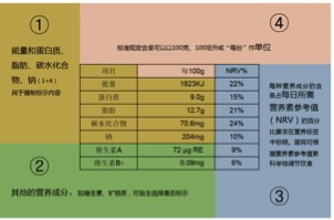 “營養(yǎng)成分表”是營養(yǎng)標簽的核心內(nèi)容。其中能量和蛋白質(zhì)、脂肪、碳水化合物、鈉的含量為強制標示的內(nèi)容,又稱“1+4”。其他成分如鈣、鐵、維生素等信息,由生產(chǎn)企業(yè)自愿標示。
