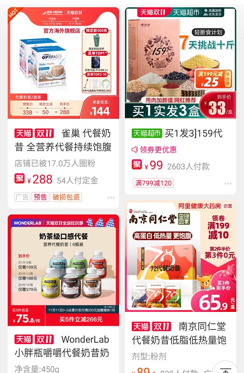 記者在電商平臺搜索關(guān)鍵詞“代餐”,發(fā)現(xiàn)相關(guān)產(chǎn)品五花八門,品種多樣。代餐食品的銷售除了立足傳統(tǒng)電商平臺,也在深度布局社交自媒體,通過朋友圈、短視頻以及各類APP策劃線上活動,打造品牌IP,吸引年輕人。
