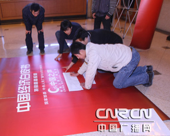 現(xiàn)場搭建直播背板(中廣網(wǎng) 李倩/攝影)