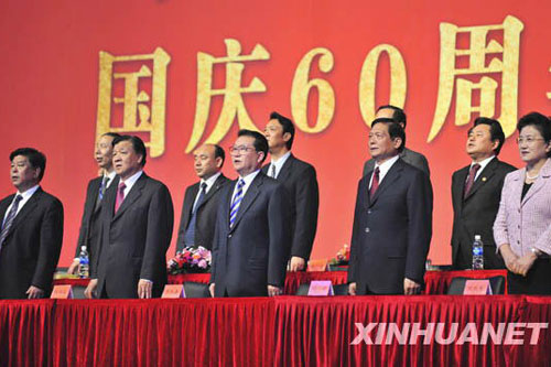 9月25日,“百團(tuán)萬(wàn)人頌中華”國(guó)慶60周年大型合唱歌詠會(huì)在北京“水立方”舉行。中共中央政治局常委李長(zhǎng)春出席觀看。這是李長(zhǎng)春等與全場(chǎng)群眾一起唱響《歌唱祖國(guó)》。新華社記者謝環(huán)馳攝