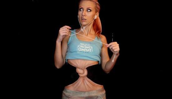 這位腦洞大開(kāi)的化妝師米亞娜里·基卡·米洛舍維奇說(shuō),要給自己的腰打結(jié),只需要一面黑色的墻和一套化妝品即可。首先,用一支棕色的筆勾勒出打結(jié)的輪廓。然后,用較淺的顏色和熒光筆來(lái)修飾這個(gè)結(jié),或模糊、混合顏色,或加陰影。而后,用深棕色來(lái)描繪輪廓,讓這個(gè)結(jié)看起來(lái)更加真實(shí)。最后,在身體兩邊涂上黑色,使之與黑色背景融為一體,就可“擦”掉自己的身體,留下一個(gè)打結(jié)的腰。
