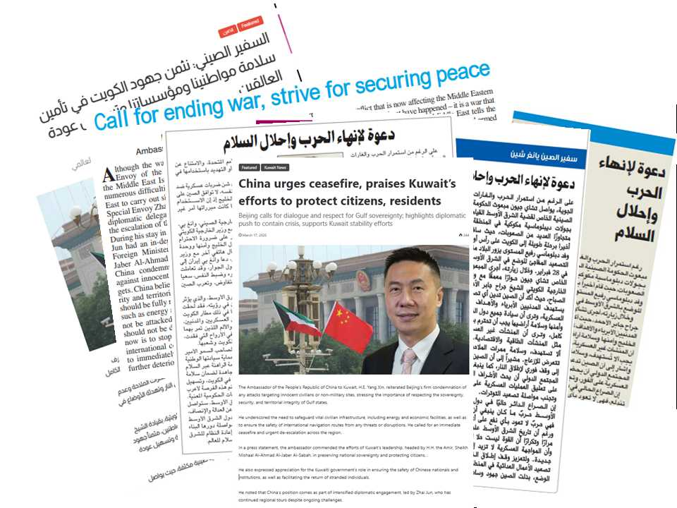 2026年3月18日,駐科威特大使楊欣在《消息報》《輿論報》等科主流媒體發(fā)表署名文章《為止戰(zhàn)吶喊,為和平奔走》(圖片來源:中國駐科威特大使館網(wǎng)站)