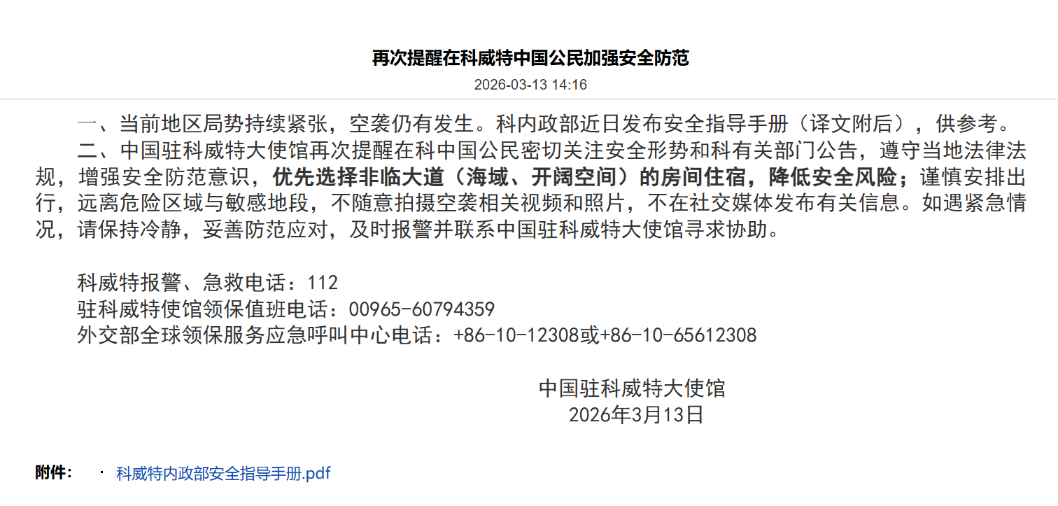 在這里,我也再次提醒全體在科威特的中國同胞,密切關注形勢發(fā)展和當?shù)卣l(fā)布的安全指引,減少不必要外出和人員聚集,避免前往軍事設施及其他敏感區(qū)域,切實降低安全風險。建議大家通過“中國領事”APP等渠道及時登記個人信息,保持通訊暢通,以便在緊急情況下獲得協(xié)助。