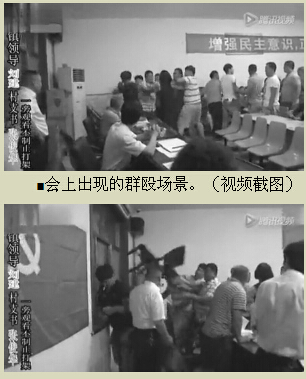 現(xiàn)場(chǎng)視頻可見(jiàn),坐在詹俊東右邊隔著一個(gè)人的村支書(shū)張俊華伸手要把話筒拿回來(lái),被詹俊東拒絕,兩個(gè)人開(kāi)始爭(zhēng)吵。臺(tái)下有村民和詹俊東的女兒分別上前幫手,爭(zhēng)吵中爆發(fā)出粗口,并開(kāi)始抓扯爭(zhēng)搶麥克風(fēng)。詹俊東的女兒將麥克風(fēng)扔出,砸碎玻璃,之后推搡一名男子,再抓起桌上的物品扔向另一名男子,隨后,她也被對(duì)方推倒在地。雙方多人加入,互相抓扯,有人舉起木質(zhì)座椅砸向?qū)Ψ。混亂持續(xù)大約3分鐘。