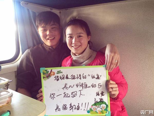 記者在這趟列車上買一個(gè)白板,每一個(gè)采訪對(duì)象都可以留下自己想說的話。張震和杜琴也在白色板上寫下了一段話:婚姻是愛情的墳?zāi),我心甘情愿的與你一起留下,我很幸福。張震說,自己找到了一個(gè)好老婆。