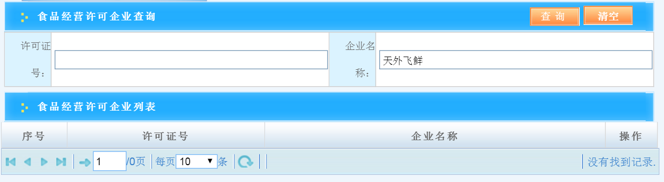 “天外飛鮮”在食品經營許可企業(yè)列表查詢中無記錄