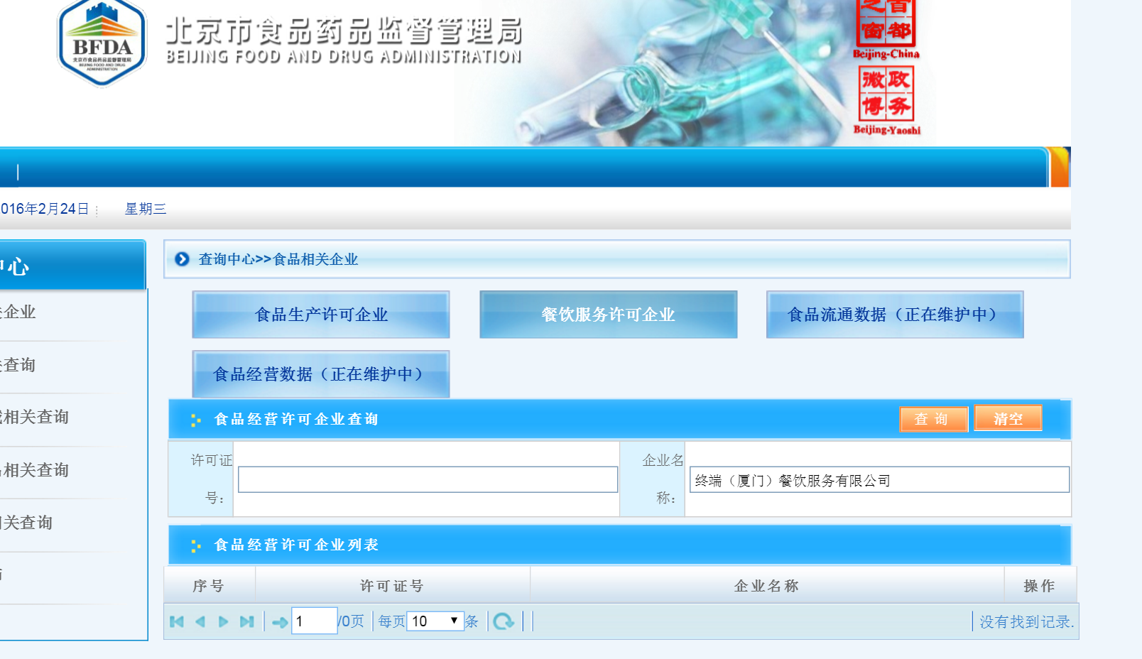 終端(廈門)餐飲服務有限公司在食品經營許可企業(yè)列表查詢中也無記錄