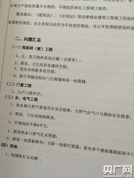 王蒼宇:比如說有木地板空鼓,墻磚空鼓,門鎖的調(diào)試,玻璃的劃痕,裝修房我們有很多裝修的項(xiàng)目,也有很多裝修的單位。