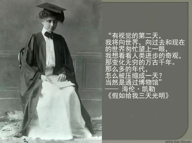 有視覺(jué)的第二天,我將向世界,向過(guò)去和現(xiàn)在的世界匆忙望上一眼,我想看看人類(lèi)進(jìn)步的奇觀(guān),那變化無(wú)窮的萬(wàn)古千年。這么多的年代,怎么被壓縮成一天?當(dāng)然是通過(guò)博物館—— 美國(guó)著名盲人作家海倫·凱勒《假如給我三天光明》