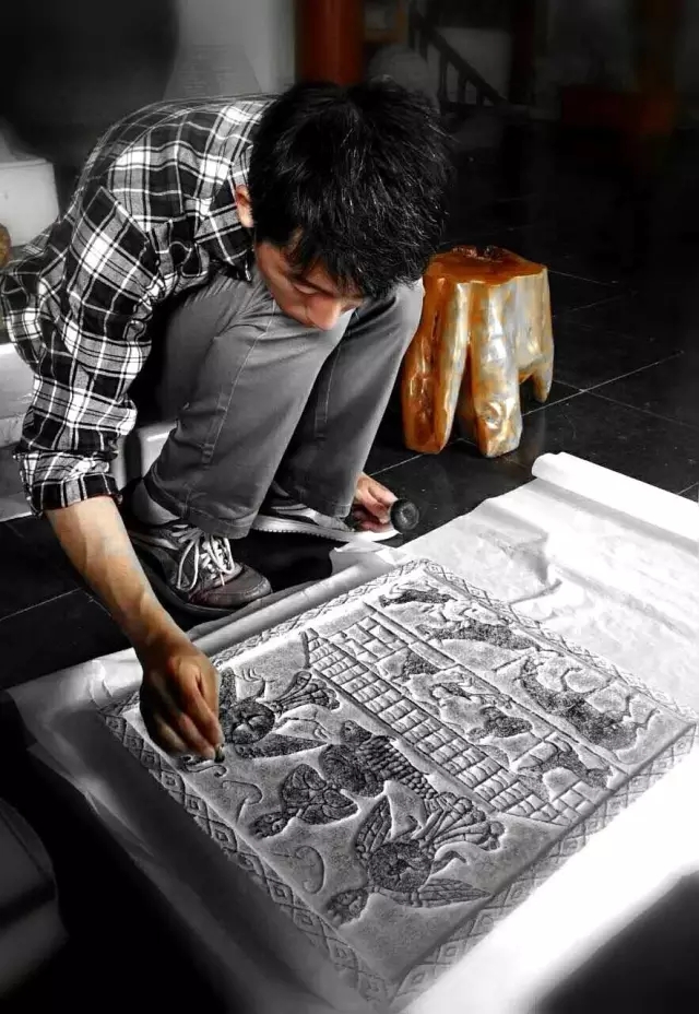 古陶文明博物館工作人員制作漢代畫(huà)像磚拓片 記者杜希萌攝