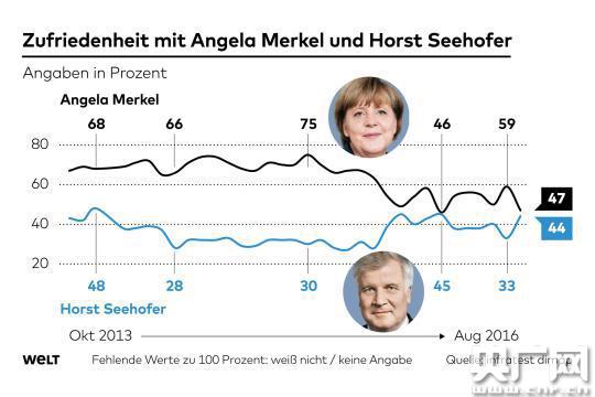據(jù)德國最大的公共廣播電視機(jī)構(gòu)ARD公布的民調(diào)顯示,在7月間的系列攻擊事件發(fā)生之后,默克爾的民望下滑到74%,丟失12個(gè)百分點(diǎn)。