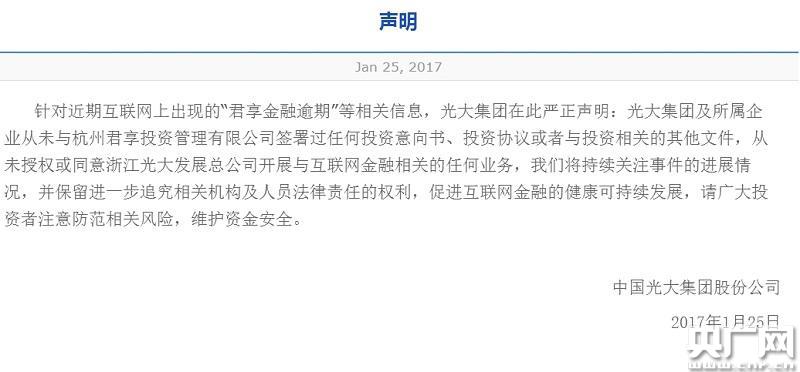 早在2016年6月30日,浙江光大發(fā)展總公司發(fā)布了一則關(guān)于戰(zhàn)略投資企業(yè)及戰(zhàn)略合作伙伴的聲明。聲明中明確君享金融是其子公司的戰(zhàn)略合作伙伴,但在君享金融出事當(dāng)天,也就是2017年1月8日,光大方面卻將上述聲明中關(guān)于君享金融的內(nèi)容刪除。
