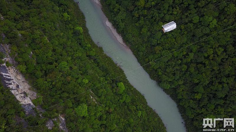 從運(yùn)行的索道上望下去,兩側(cè)的山壁上有濃密的樹叢,也有裸露的巖石,青綠色的溇水河從谷底流過,看起來只是細(xì)長(zhǎng)的一條。