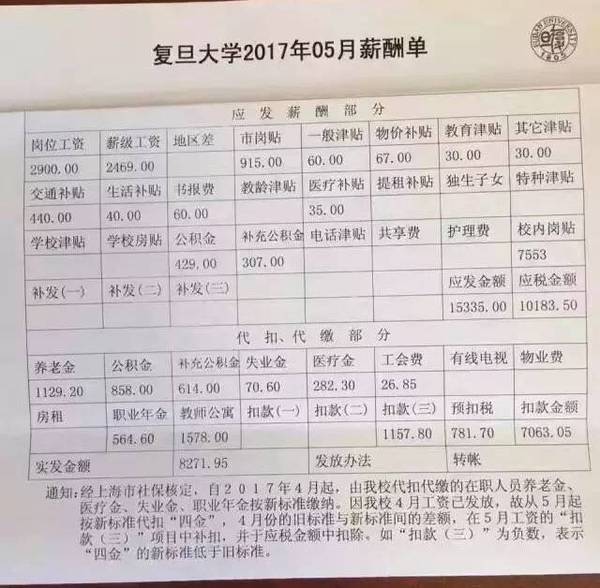 央廣網(wǎng)上海5月27日消息(記者吳喆華)據(jù)中國(guó)之聲《新聞縱橫》報(bào)道,這兩天,微信朋友圈里流傳的一張復(fù)旦大學(xué)教授的工資條火了,該朋友圈感嘆說(shuō),一位在復(fù)旦大學(xué)工作30年的教授,還是教育部“新世紀(jì)優(yōu)秀人才”,5月份應(yīng)發(fā)工資15335元,實(shí)發(fā)8271.95元。有評(píng)論說(shuō),“上海住家保姆的月工資是五千左右,月嫂工資過(guò)萬(wàn)”,教授還不如月嫂。這張網(wǎng)傳復(fù)旦大學(xué)教授的工資條是真的么?為何實(shí)發(fā)到手的金額僅僅是應(yīng)發(fā)工資的一半?