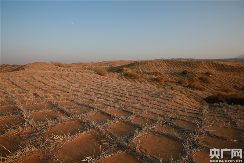 治沙幾十年,草方格是中衛(wèi)人抵御風(fēng)沙蔓延的陣型。廢棄麥草一束束鋪就方格狀的四邊,再用鐵鍬把它們插進(jìn)沙里,留麥草的三分之一到一半立在沙子外。麥草就這樣釘在了沙上。