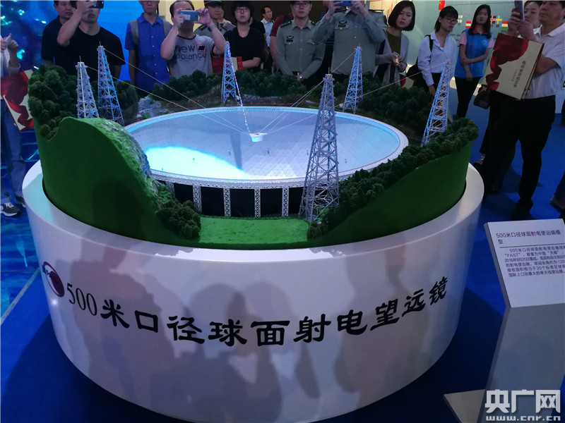 一個(gè)圓形的模型吸引了不少人的目光。這是直徑約2.3米的“天眼”模型。雖然眼前的它,四五個(gè)人就能環(huán)抱住,但實(shí)際上這座具有我國(guó)自主知識(shí)產(chǎn)權(quán)的射電望遠(yuǎn)鏡(FAST),接受面積有三十個(gè)標(biāo)準(zhǔn)的足球場(chǎng)大。有意思的是,在圓形望遠(yuǎn)鏡的上方,通過四周的鋼索吊著一個(gè)饋源艙。它的作用是什么呢?在現(xiàn)場(chǎng),中科院文獻(xiàn)情報(bào)中心的趙耀向記者表示,如果把望遠(yuǎn)鏡比作一只眼睛,饋源艙相當(dāng)于它的視網(wǎng)膜,所有收集到的宇宙信號(hào)都要匯集到這里,“饋源倉在整個(gè)球面上可以移動(dòng)。它移動(dòng)到那邊之后,有一個(gè)顯示的區(qū)域會(huì)亮,表示這片區(qū)域能接受到宇宙射線。模型藍(lán)色的區(qū)域,表示它能接受信號(hào)的區(qū)域。隨著地球的公轉(zhuǎn)、自轉(zhuǎn)和它本身結(jié)構(gòu)的調(diào)整,就能完成整個(gè)宇宙巡天的工作!