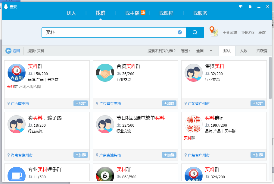 在QQ群以“買料”“信息”為關(guān)鍵詞進行搜索,立刻就能找到大量專門販賣個人信息的群,同時在百度貼吧中,“數(shù)據(jù)購買”“精準(zhǔn)數(shù)據(jù)”等貼吧也能輕易找到各種類似廣告。