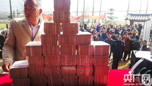 中午12點半,距離分錢還有半個小時,白巖下村仙巖風(fēng)景區(qū)大門口前的小廣場上已經(jīng)聚集了大批村民。他們的眼睛都盯著十幾米開外的一張披著大紅綢子的長條桌,上面一沓一沓的百元大鈔摞了好幾層高,足足有300多萬元。