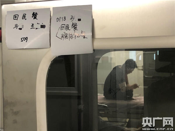 記者探訪第五病區(qū),從清潔區(qū)的內(nèi)走廊,透過玻璃窗可以看見患者在病房里走動,躺在床上看手機(jī),或者請醫(yī)護(hù)人員幫忙調(diào)試床邊的小電視,還有患者對著記者的鏡頭揮手微笑。病房和清潔區(qū)之間沒有門進(jìn)出,只有一個消毒傳遞柜,內(nèi)外兩扇門能先后打開,患者的一日三餐通過中間的可消毒空間傳遞。柜門上寫著一些特殊的飲食需求:清真餐、糖尿病餐,不吃米飯只要饅頭大餅等。