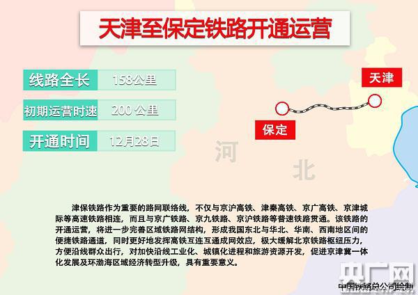 央廣網(wǎng)天津12月28日消息(記者郭淼)據(jù)中國(guó)之聲《央廣新聞》報(bào)道,記者從中國(guó)鐵路總公司獲悉,12月28日,天津至保定鐵路開(kāi)通運(yùn)營(yíng),天津到保定的運(yùn)行時(shí)間將由原來(lái)的2小時(shí)36分壓縮至1小時(shí)左右,東北到華北、華南、西南地區(qū)間的運(yùn)行時(shí)間也將大幅度壓縮。